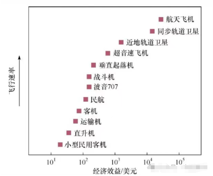 随着航空航天技术的不断进步,对材料性能的要求变得越来越严格和复杂,温度耐受性、比强度比刚度更高,对抗疲劳和抗冲击的综合性能要求更高。轻量化也是关键趋势,以减少飞行器重量,降低燃料消耗,提高飞行效率。如图8所示,飞行器每减重1kg的经济效益高达约10万美元(航天载具每公斤发射成本约5万美元),当代技术的进步已显著降低,以SpaceX猎鹰9号为例,每公斤发射成本已降至2,720美元,而猎鹰重型火箭更低至1,410美元/kg,减重效益相应降低。此外,航空航天材料正向着智能化发展,集成自修复和自监测功能,以提高飞行器的整体可靠性和安全性。